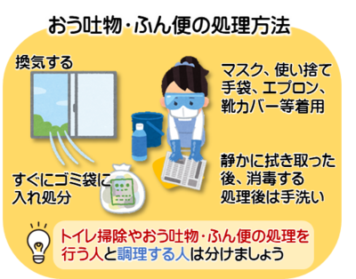 避難所等において体調が悪くなった時は、すぐに避難所等の運営スタッフに知らせましょう。感染を広げないためには、適切な方法で施設の消毒やおう吐物・ふん便の処理を行う必要があります。