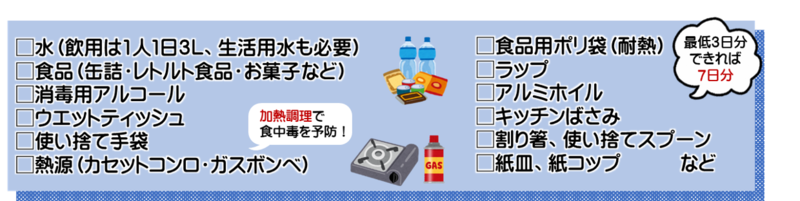 在宅避難ができるよう、家族の人数分の食料品や日用品などを備蓄しておきましょう。