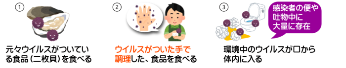 - 元々ウイルスがついている食品(二枚貝)を食べる