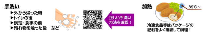 また、ノロウイルスの汚染リスクがある食材(カキなどの二枚貝等)は、 しっかり加熱(中心部85℃~90℃で90秒加熱)してください。