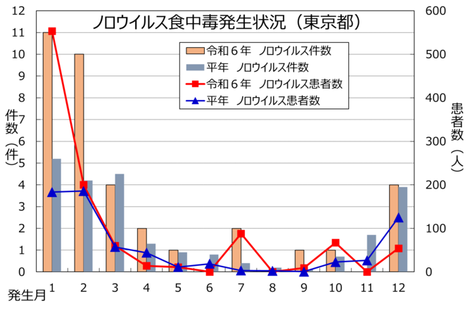 令和6年は、都内で食中毒が114件(患者数1,536人)発生しました。ノロウイルスを原因とするものが発生件数および患者数が一番多く、36件(患者数1,056人)で、ほとんどが冬季に発生していました。