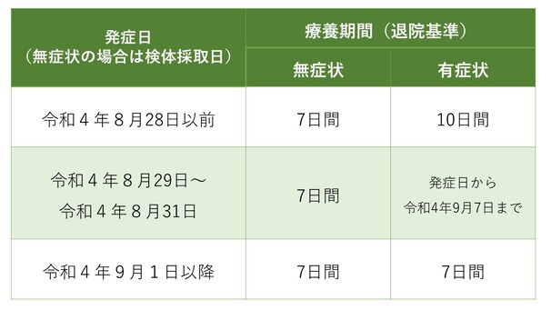 注釈:療養終了日は、新型コロナウイルス感染症の退院基準(厚生労働省通知に基づく)を満たした日です。その他の疾患での入院や自主的な隔離期間は対象外です。退院基準は以下の表のとおりです。