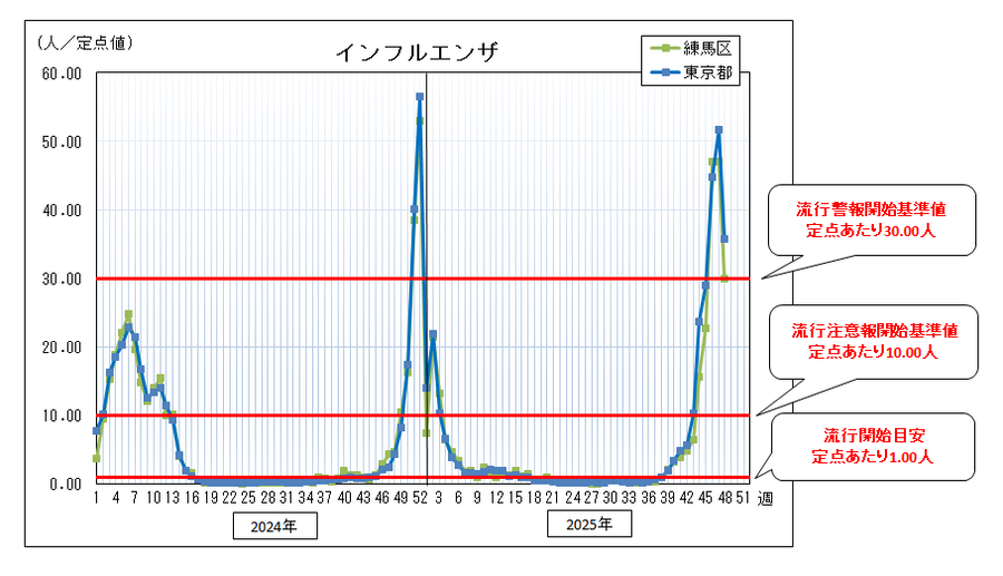区内のインフルエンザ定点医療機関からの11月10日から11月16日(第46週)の患者報告数が47.10人となり、警報基準(30.0人)を超えました。昨年よりも5週早く警報基準を上回り、インフルエンザの流行が拡大しています。