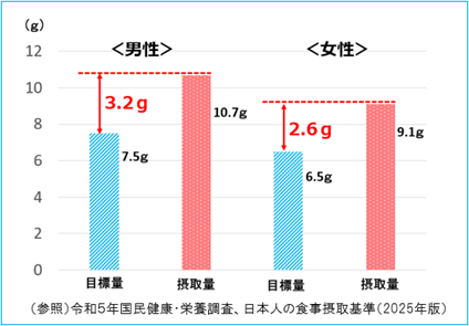 日本人の食事摂取基準2025では、1日の食塩の摂取量を男性で7.5g未満、女性で6.5g未満にすることが目標とされていますが、目標量と私たちが実際に食べている量を比較すると、男女ともに、摂取量が目標量を上回っています。