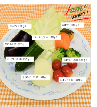 健康日本21(第三次)では、1日の野菜摂取量の目標を350g以上としていますが、私たちが実際に食べている量は250g程度で、目標量に達していないことが分かっています。
