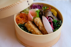 週替りのわっぱ弁当には主食(ご飯)主菜(肉や魚)副菜(野菜を使用したおかず)