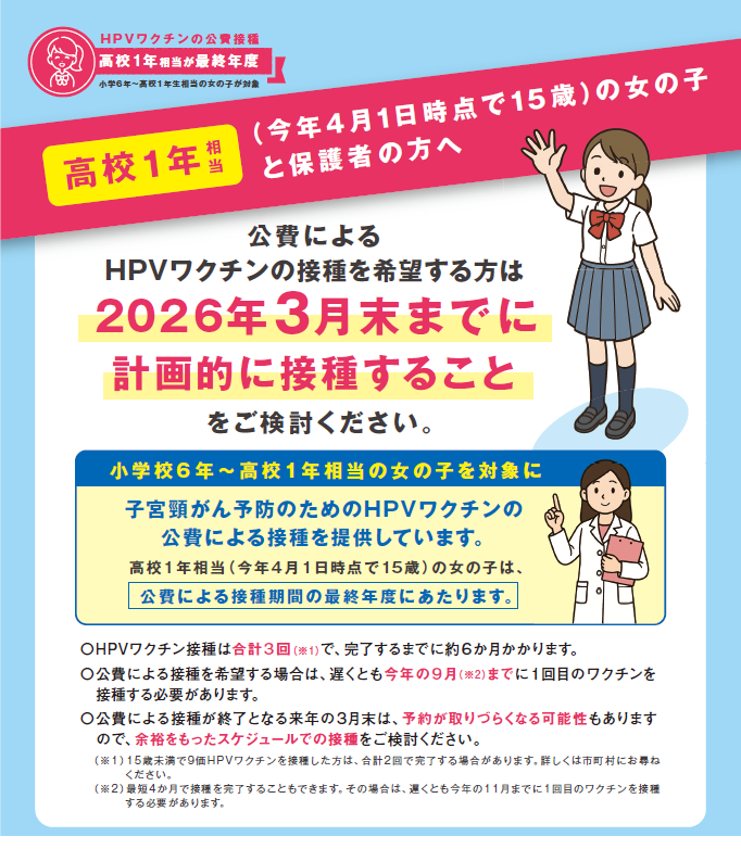 子宮頸がん(HPV感染症)ワクチンを公費で接種できるのは、令和8年3月31日までです。