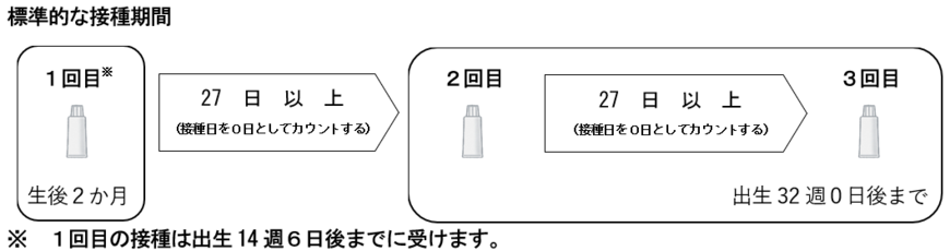 1回目の接種期間は、出生6週0日後(標準的な接種開始は生後2か月)から出生14週6日後までです。