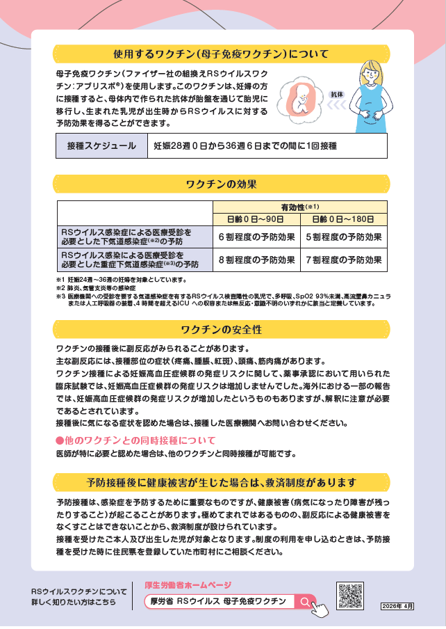 令和8年4月1日から、妊婦の方を対象としたRSウイルス感染症に対する母子免疫ワクチンの定期接種を開始予定です。