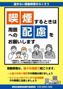 区では、受動喫煙防止啓発チラシおよびステッカーを作成し、区内薬局等で配布しています。