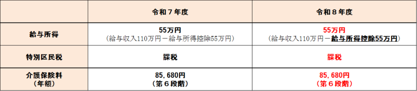 ただし、令和7年度の特別区民税が非課税で、令和6年中と比べた令和7年中の給与所得の増額が令和7年度税制改正による給与所得控除の引上げ分の範囲内だったことにより、令和8年度の特別区民税も非課税となった方は、介護保険料の算定においても「非課税」として取り扱います。