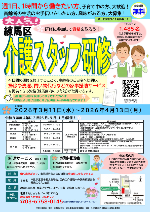 介護に関する基本的な知識および技術を習得するための研修です。研修を修了した方は、区内で要支援1または2に相当する方を対象とした訪問サービス(家事援助のみ)に従事できる資格を取得できます。また、研修修了後には、区内事業者が参加する「就職相談会」を実施しています。令和8年度は5月・9月・1月に開催する予定です。