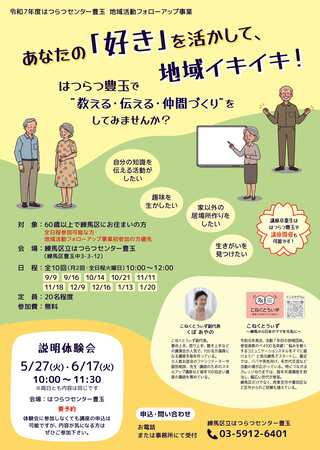 はつらつセンター(光が丘・関・豊玉・大泉)では、地域で活動したい方やボランティア活動を希望する方へのサポート、活動の機会の提供を行っています。