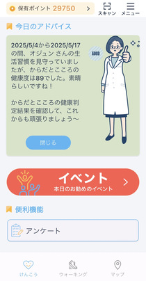 歩数や睡眠、血圧を記録して、AIがあなたのフレイルリスクを点数化しアドバイス。区内のイベントやサークル情報を提供する機能もあります。