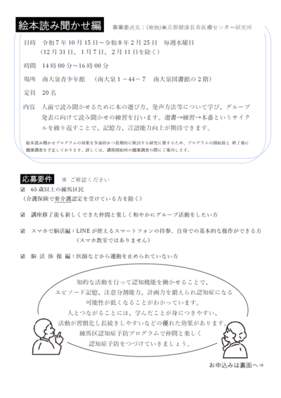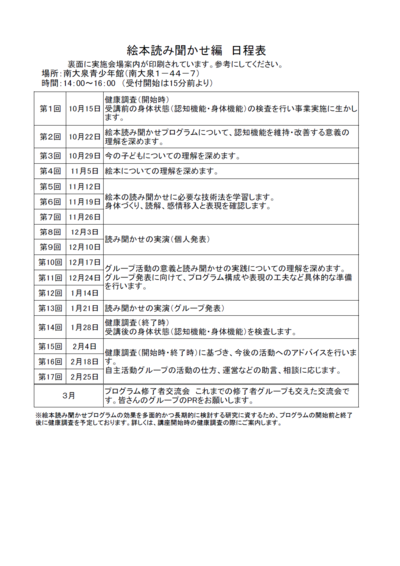 人前で読み聞かせを行うために、本の選び方、発声方法等について学びます。講座の後半はグループ発表に向けて読み聞かせの練習を行います。本を選ぶ→練習する→本番に臨む、というサイクルを繰り返すことで、記憶力や言語能力の向上が期待できます。
