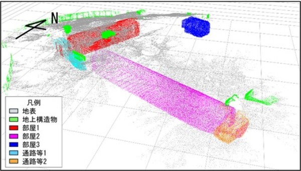 ボーリング調査を行った際、レーザースキャナーを用いて地下施設の位置関係を表した図面です。