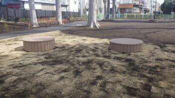 中央にある、多目的に利用ができる広場では、親子一緒に縁台ベンチでゆっくり休憩できます。