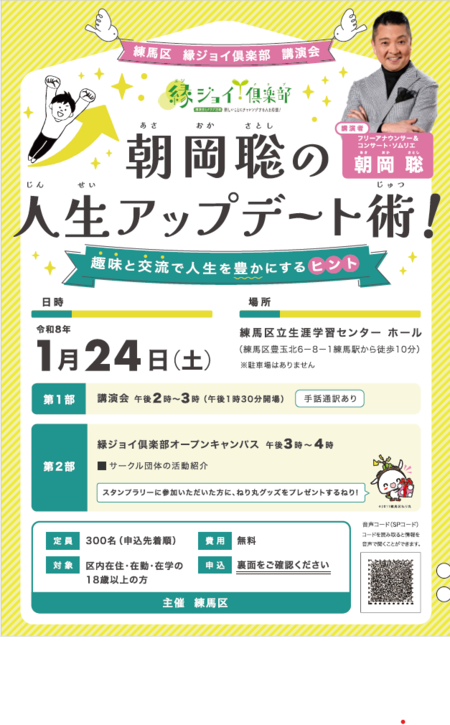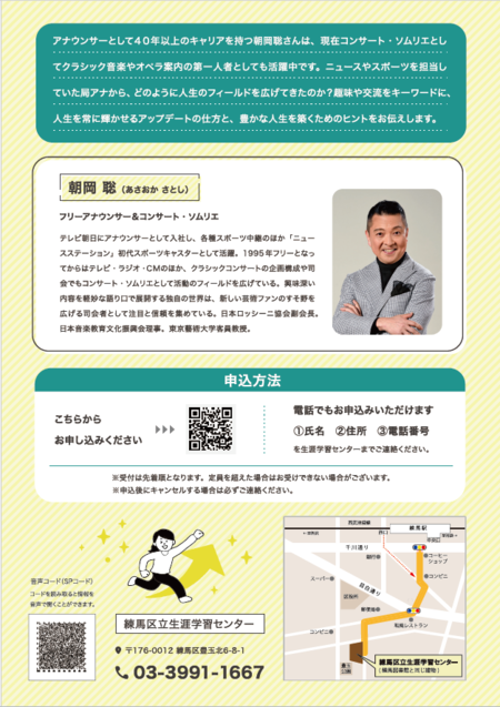 フリーアナウンサーの朝岡聡さんをお招きし、趣味や交流の大切さについてお話をいただきます。ニュースやスポーツを担当していた局アナから、どのように人生のフィールドを広げてきたのか、趣味や交流をキーワードにご紹介します。講演後には、生涯学習センター等で活動しているサークルの見学ができるオープンキャンパスも開催します。あなたにぴったりの趣味を見つけてみませんか?