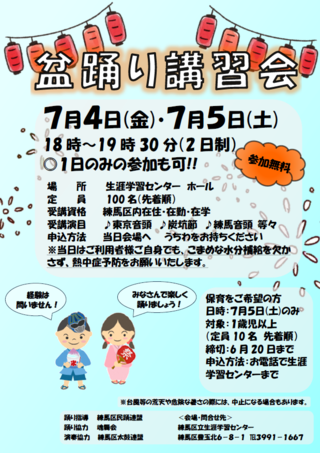 盆踊りの代表的な曲目の振り付けを練馬区民踊連盟の指導、魂舞会の協力で練習し、皆さまの地域の盆踊りをより楽しんでいただく目的で実施しております。2日目は練馬区太鼓連盟の演奏もあります。