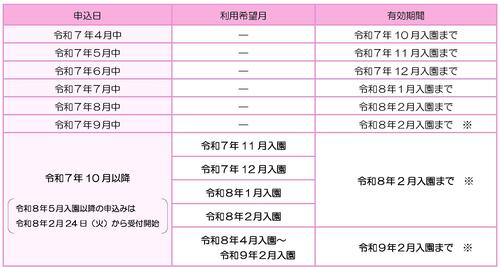 ※令和7年10月以降、提出された申込書の有効期間は、申請取下げの希望がない限り、原則として当該年度の2月入園の利用調整までです。翌年度4月以降の入園を希望する場合は、改めて4月以降の入園申請(申込書類一式の提出)が必要です。