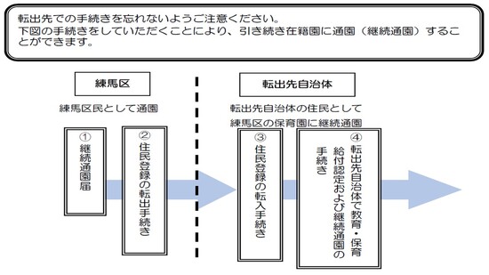 - 練馬区外へ転出後も在園中の保育園へ引続き通園を希望する場合は、転出前に『退園(継続通園)届』を提出してください(下図(1)(2))。(地域型保育事業・認定こども園(2号利用)の場合は、利用施設への提出が必要です。)