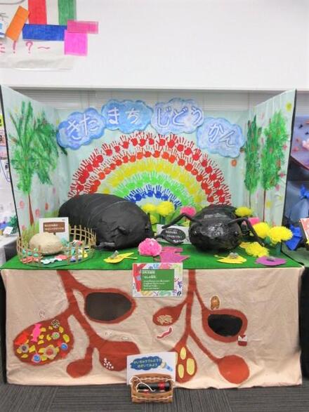 北町児童館「虫の世界」小さなダンゴムシやアリを巨大化して再現し、下にはのぞいて楽しめるアリの巣も作りました。