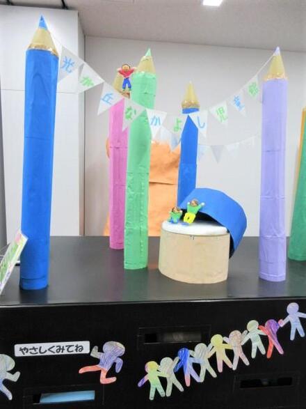 光が丘なかよし児童館「巨大文房具ひみつきち」巨大なえんぴつやのりなど大きくなった文房具を使って秘密基地を作りました。黒い箱の中では遊んでいる子どもたちが隠れています。