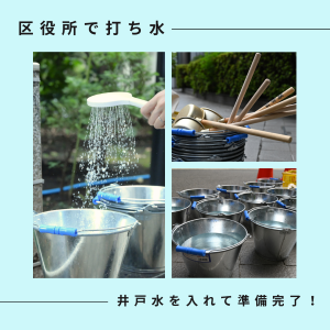 バケツとひしゃくが無くても、洗面器やボウルにいれた水を手ですくってまいたり、じょうろや空き容器で水をまいたりするなど、お家にあるもので打ち水を行うことができます。