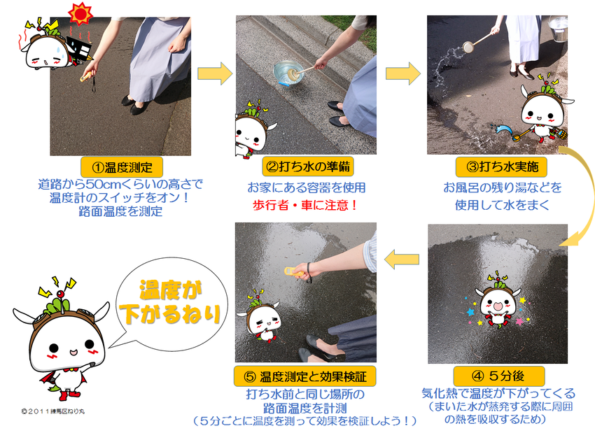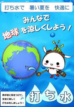 こまめに水分補給し、帽子を着用して打ち水をしましょう。