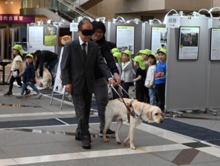 区役所にて開催された啓発イベント「盲導犬(アイメイト)って知ってる?」を視察しました。イベントではパネル展示のほか、アイマスクをつけてアイメイトとフロアを歩く体験歩行も行っており、実際にアイメイトとの歩行を体験しました。