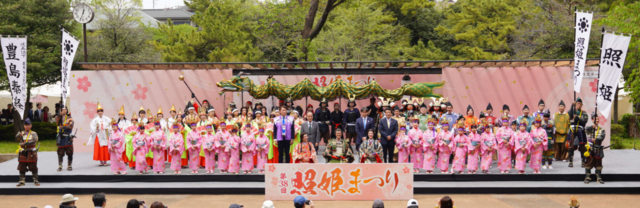 都立石神井公園とその周辺で第38回照姫まつりを開催しました。こうして盛大に開催出来た事を、主催者の一人として、心から嬉しく思っています。最大の見どころである照姫行列では、照姫、豊島泰経、奥方の三役をはじめ、豪華絢爛な時代装束に身を包んだ総勢約100名が華やかに練り歩きました。また、石神井公園駅駅前ステージでは、石神井太鼓保存会せんば太鼓の迫力ある演奏が行われるなど、出展団体や各ステージ出演団体の方々にも大いに盛り上げて頂きました。