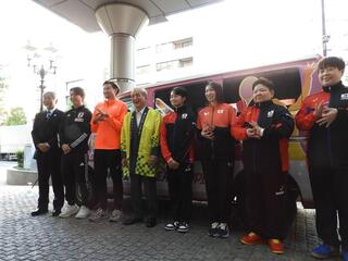 区役所にて、区にゆかりのあるデフリンピック日本代表選手4名と競技監督・スタッフの皆さんをお迎えいたしました。当日は、全国を巡回してきたデフリンピックキャラバンカーも区役所に到着し、選手団の皆さんへエールをお送りしました。
