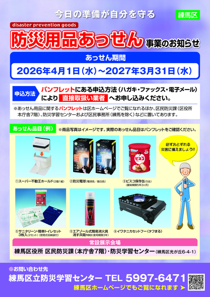 練馬区では、家具類の転倒防止用品・感震ブレーカー・、避難用品・保存食料などをあっせんしています。ご家庭での備えが、万一の時の被害を最小限に食い止めます。この機会に、ご家庭内の安全対策をしましょう。あっせん品は、ご自宅または勤務先(いずれも区内のみ)に配送します。代金は、商品と引き換えにお支払いください。