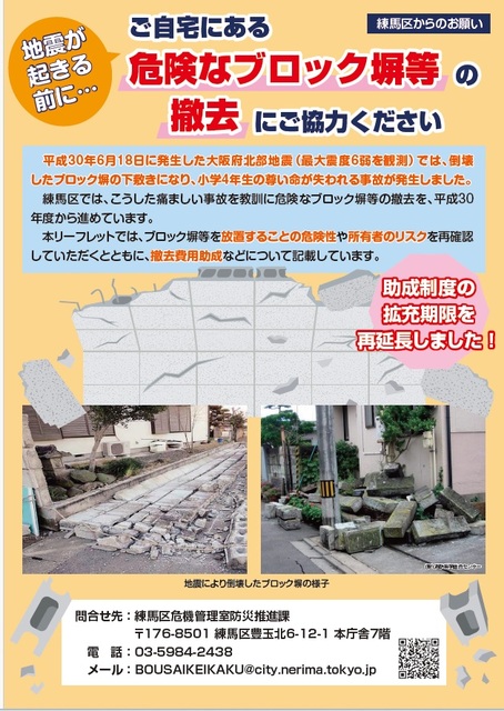 区では、大阪府北部地震での死亡事故のようなことが二度と起こらないよう、危険なブロック塀を所有している方に個別に訪問し、撤去を要請しています。また、ブロック塀の撤去費用に対する助成制度を創設し、費用負担の支援をしています。