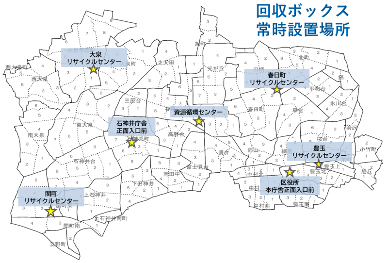 | 練馬区役所 西庁舎1階(豊玉北6-12-1) | 関町リサイクルセンター(関町北1-7-14) |