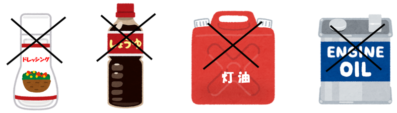 灯油・ガソリンなどの鉱物油、ラードなどの動物性脂、ドレッシングなどの食品が入った油、固まった油