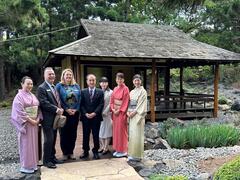 イプスウィッチ市訪問団を歓迎し、向山庭園で茶会を催しました。お点前は区立中村中学校茶道部の生徒の皆さん、練馬区華道茶道連盟の先生方にご協力いただきました。