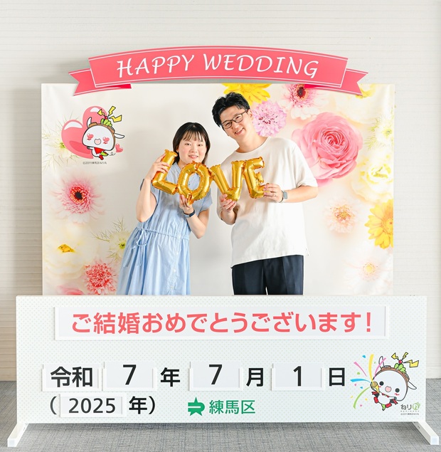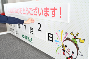 記念写真撮影スポットには、日付やお祝いメッセージの入ったパネルと、背景となるスクリーンを設置しています。