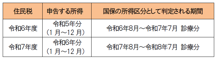 例えば、診療月が令和6年8月から令和7年7月までは令和5年中の所得、令和7年8月から令和8年7月までは令和6年中の所得により判定されます。
