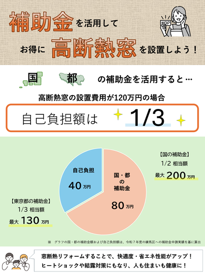 国の補助金「先進的窓リノベ事業」と東京都の補助金「既存住宅における省エネ改修促進事業」を活用することで、自己負担額を抑えて設置することができます。