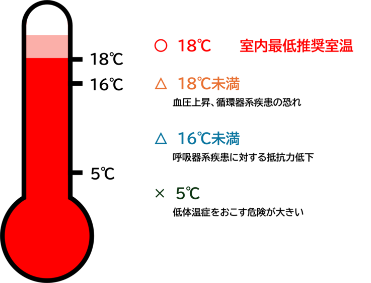 また、イギリスでも、18℃未満で血圧上昇・循環器系疾患の恐れがあり、16℃未満で呼吸器系疾患への抵抗力が低下するとして、冬季の住宅内許容室温を18℃と定めています。