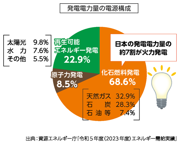 近年、太陽光発電など、再生可能エネルギーが注目を集めていますが、日本では電気の約7割が化石燃料を使用してつくられています。
