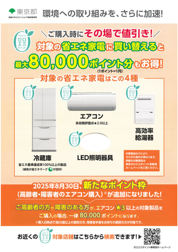 令和7年8月30日から、高齢の方や障害のある方がエアコンを購入する場合、「東京ゼロエミポイント」80,000ポイントが付与されます。