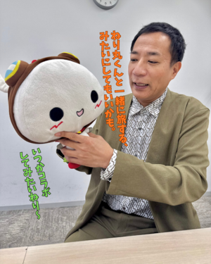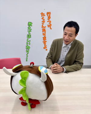 ーー塙さん:わざわざ来てくれてありがとうございます。ねり丸くん、初めて知りました、かわいいですね。(頭のアンテナを指さして)これキノコ?