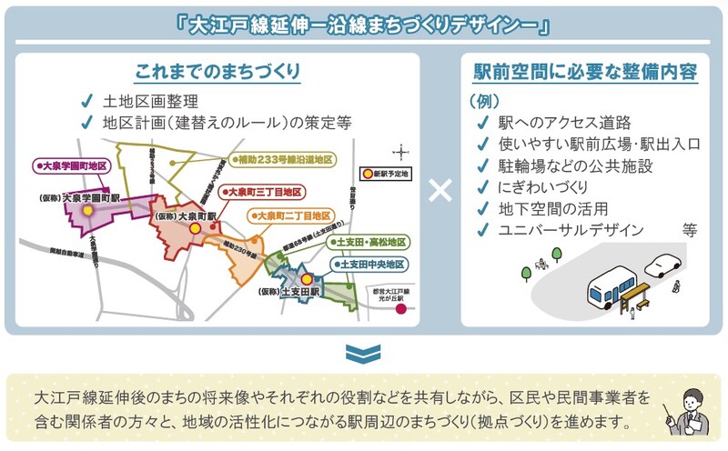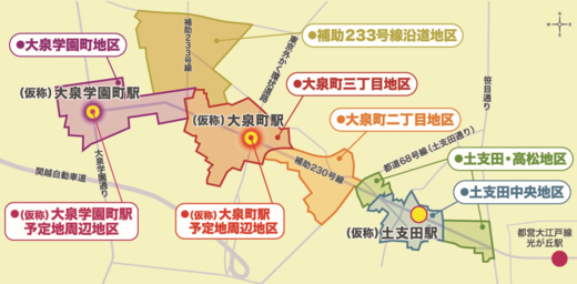 延伸区間の導入空間となる都市計画道路補助230号線の整備や大江戸線延伸地域(土支田中央地区、土支田・高松地区、大泉二丁目地区、大泉町三丁目地区、大泉学園町地区、補助233号線沿道周辺地区、(仮称)大泉学園町駅予定地周辺地区、(仮称)大泉町駅予定地周辺地区)のまちづくりについては、大江戸線延伸地域のまちづくり