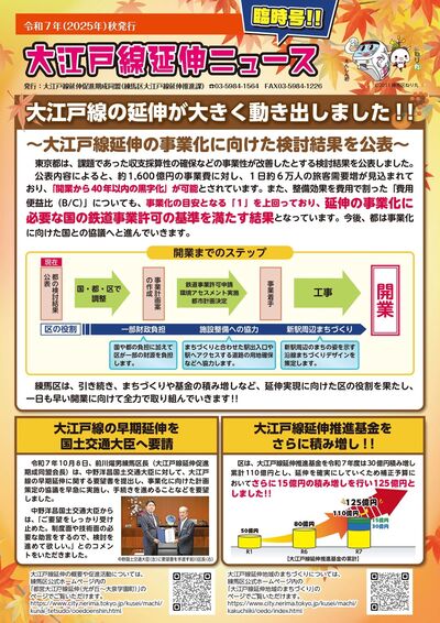 今回の臨時号では、令和7年10月に東京都が大江戸線延伸に関する庁内検討プロジェクトチームの現在の検討状況を公表し、大江戸線の延伸が大きく動き出したことなどを掲載しています。詳しくは大江戸線延伸ニュース臨時号をご覧ください。