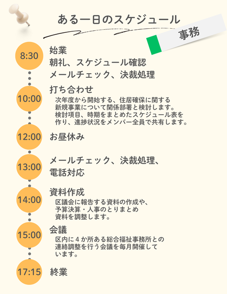 私は平成16年度に採用され、20年間事務職としてキャリアを積んできました。これまでの職歴を振り返ると、東日本大震災時における東北の自治体支援、消費税率が8%に引き上げられる際の福祉給付金の支給、新型コロナウイルス感染症の影響を受けた生活困窮者に対する支援などに携わり、臨時的・特命的な業務を任される機会が多くありました。