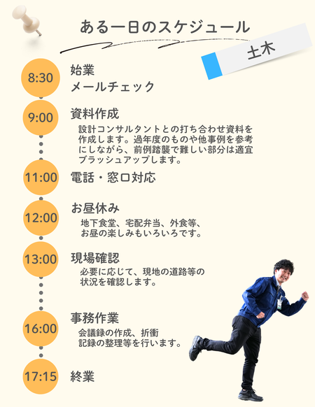 | 現在 | 入庁して5年目。橋を造るという子どもの頃の夢を今も胸に、まちを災害から守ることができる人になることが将来の目標です。 |