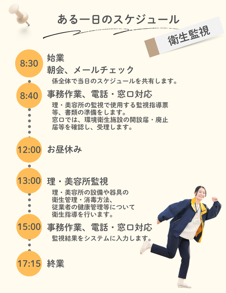 皆優しく、相談しやすい環境が整っているため、働きやすい職場だと感じています。衛生監視の仕事は知識や経験が必要になりますが、先輩や上司に確認しながら学んでいけるので、安心して仕事に取り組めます。