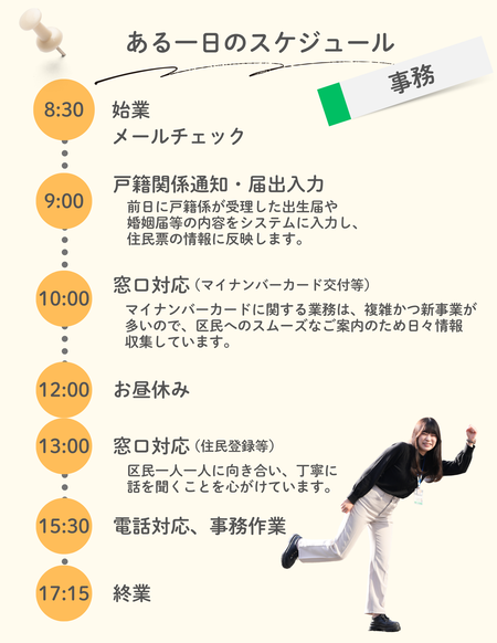 区民事務所は業務の内容も幅広くイレギュラーが多い職場ですが、その分やりがいも多く感じます。練馬区は人口も多いので、今後一層多様化するニーズに応えるためにも、より職員の意識を高める必要があります。ぜひ一緒に働き、今後の練馬区のために貢献していければと思います。